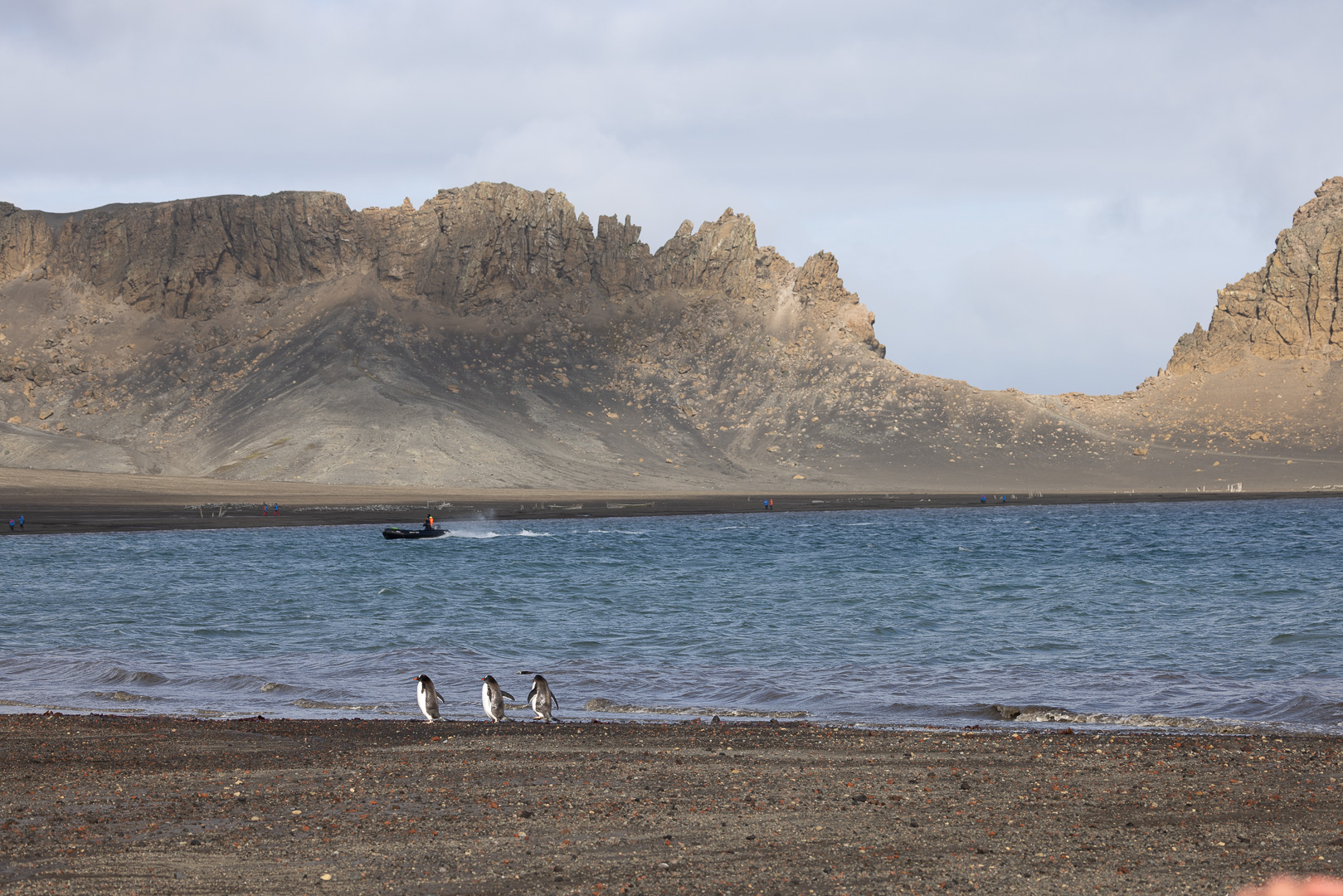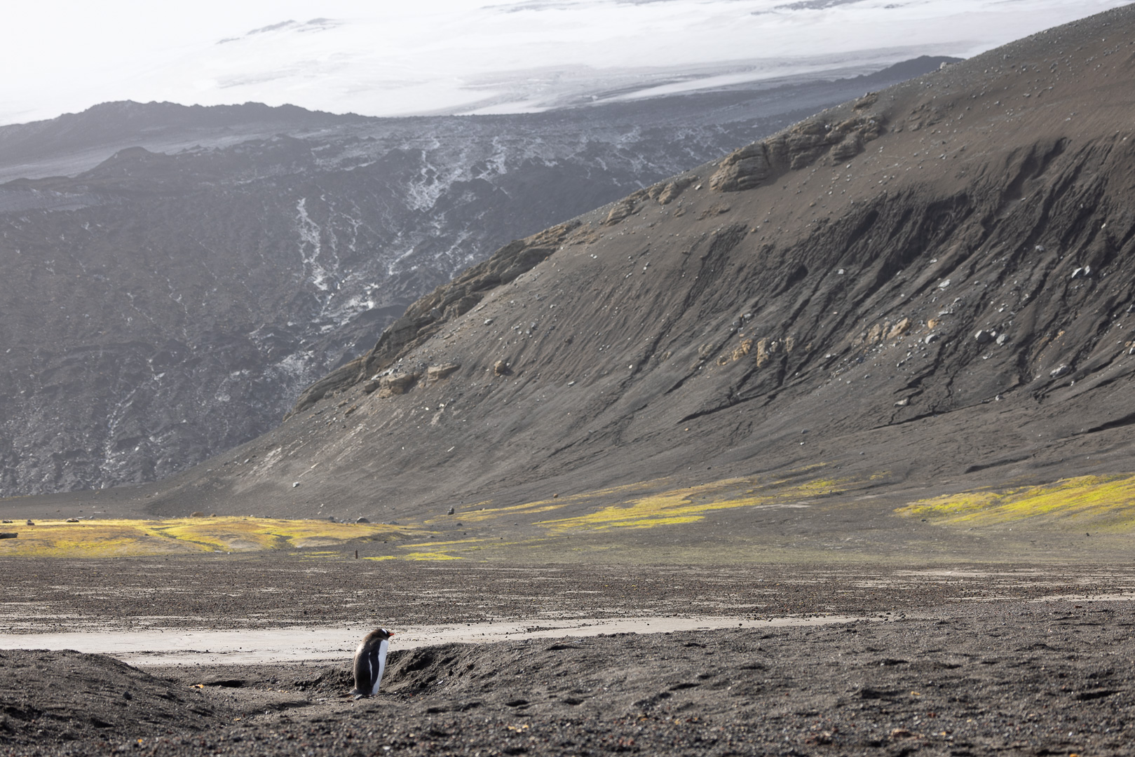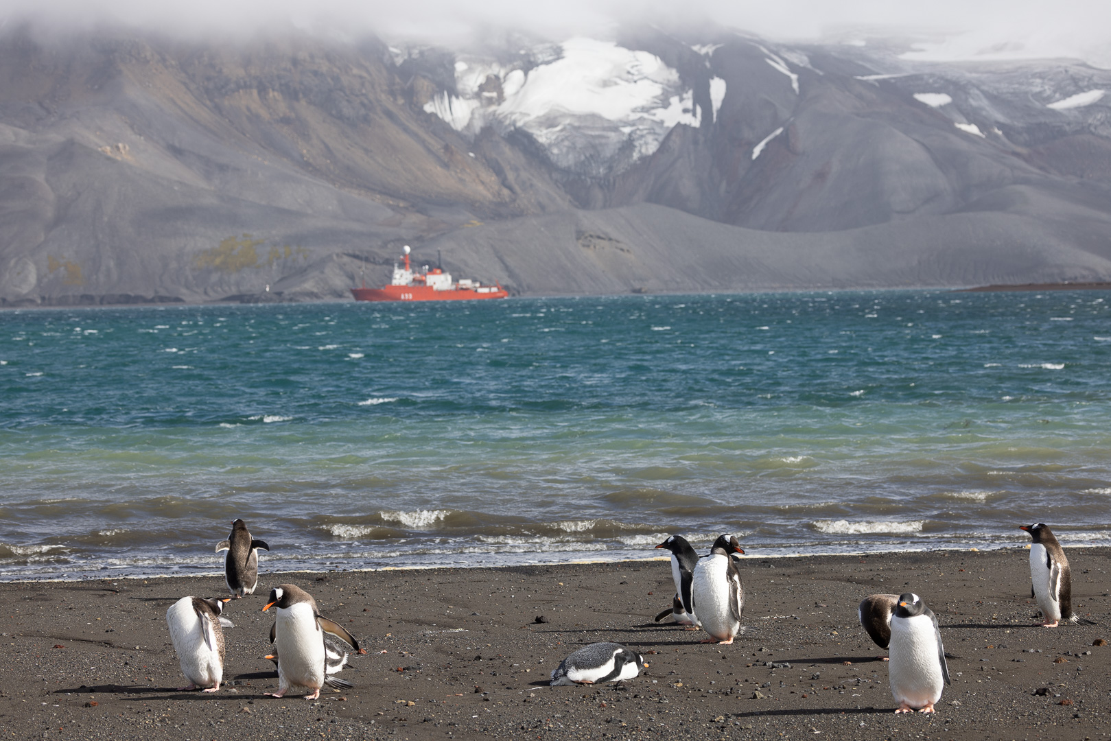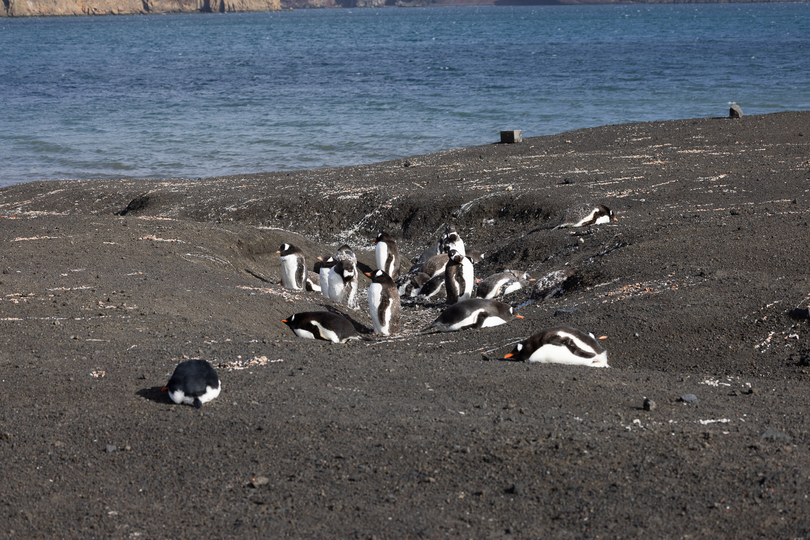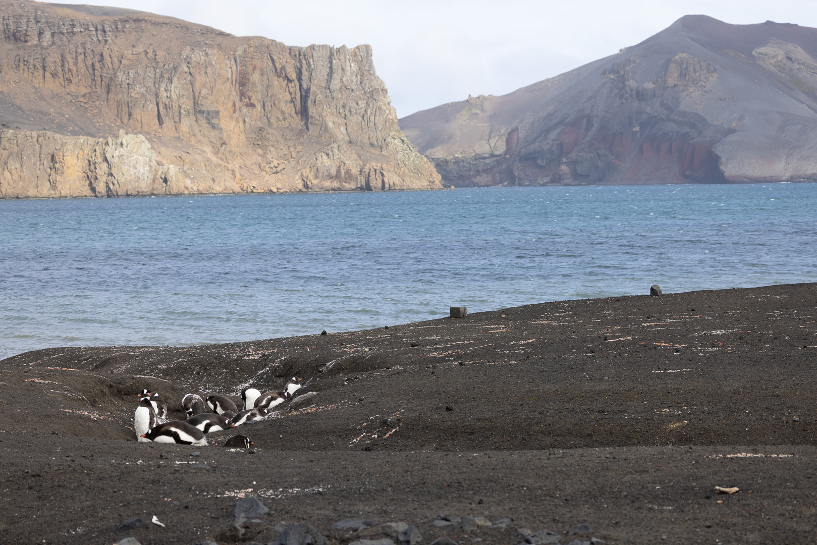 selbst den Eselspinguinen ist der Wind zu heftig und sie ziehen sich in eine Kuhle zurück. Im Hintergrund Neptuns Bellow