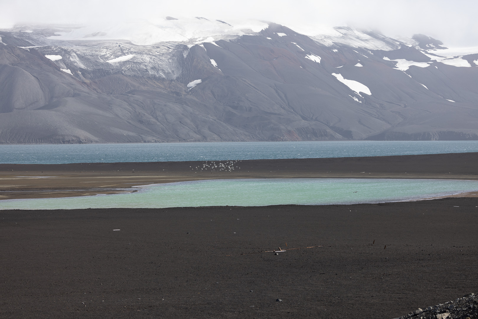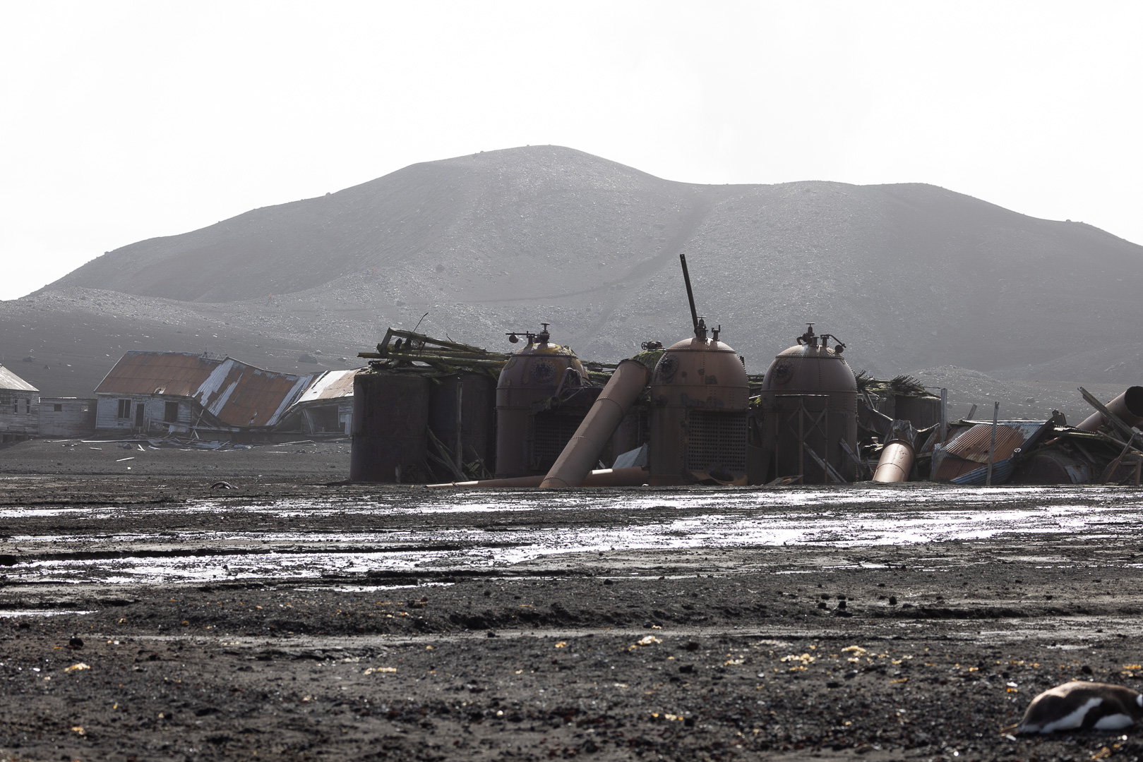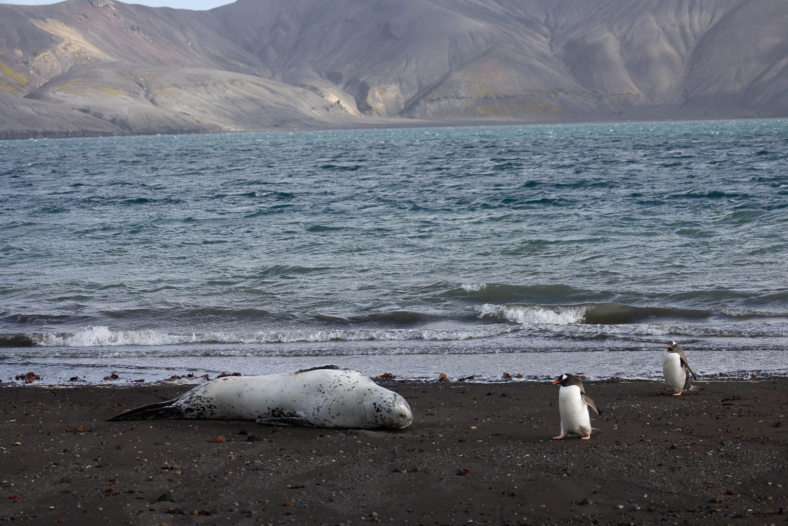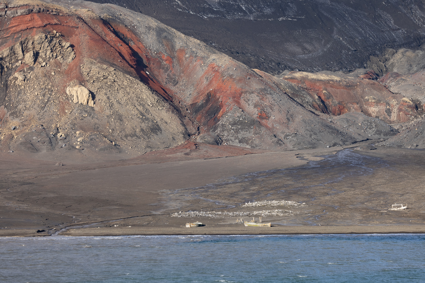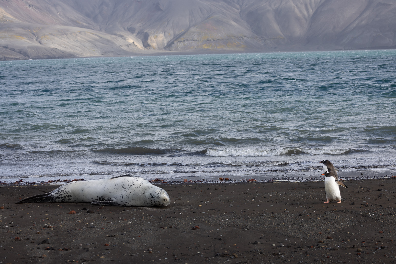 selbst den Eselspinguinen ist der Wind zu heftig und sie ziehen sich in eine Kuhle zurück. Im Hintergrund Neptuns Bellow