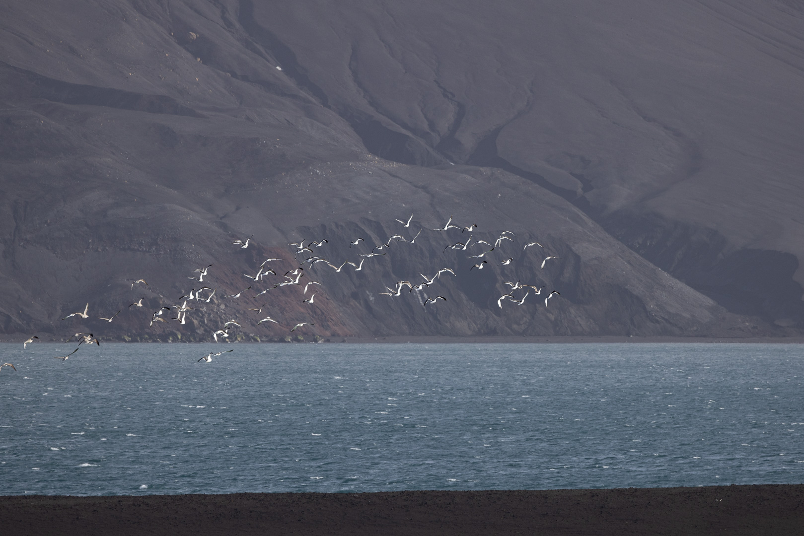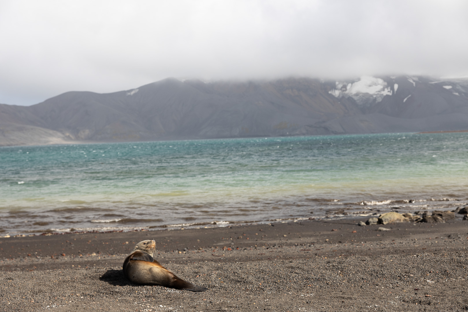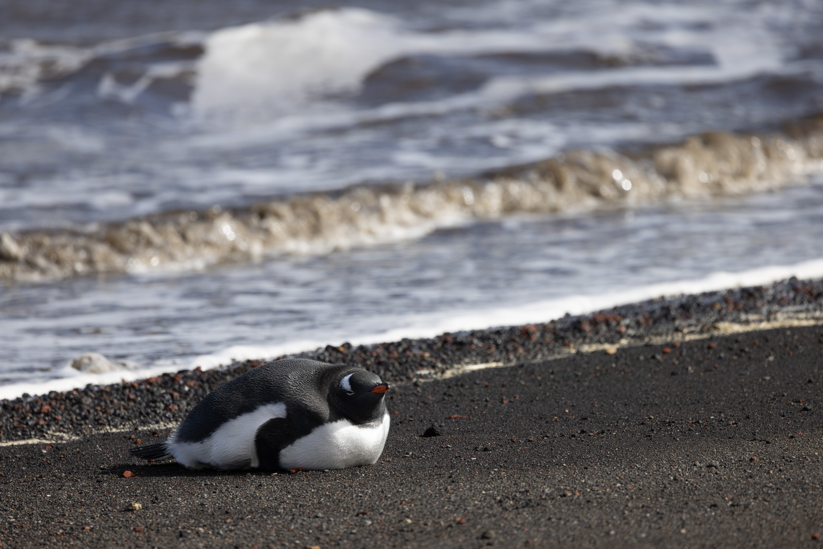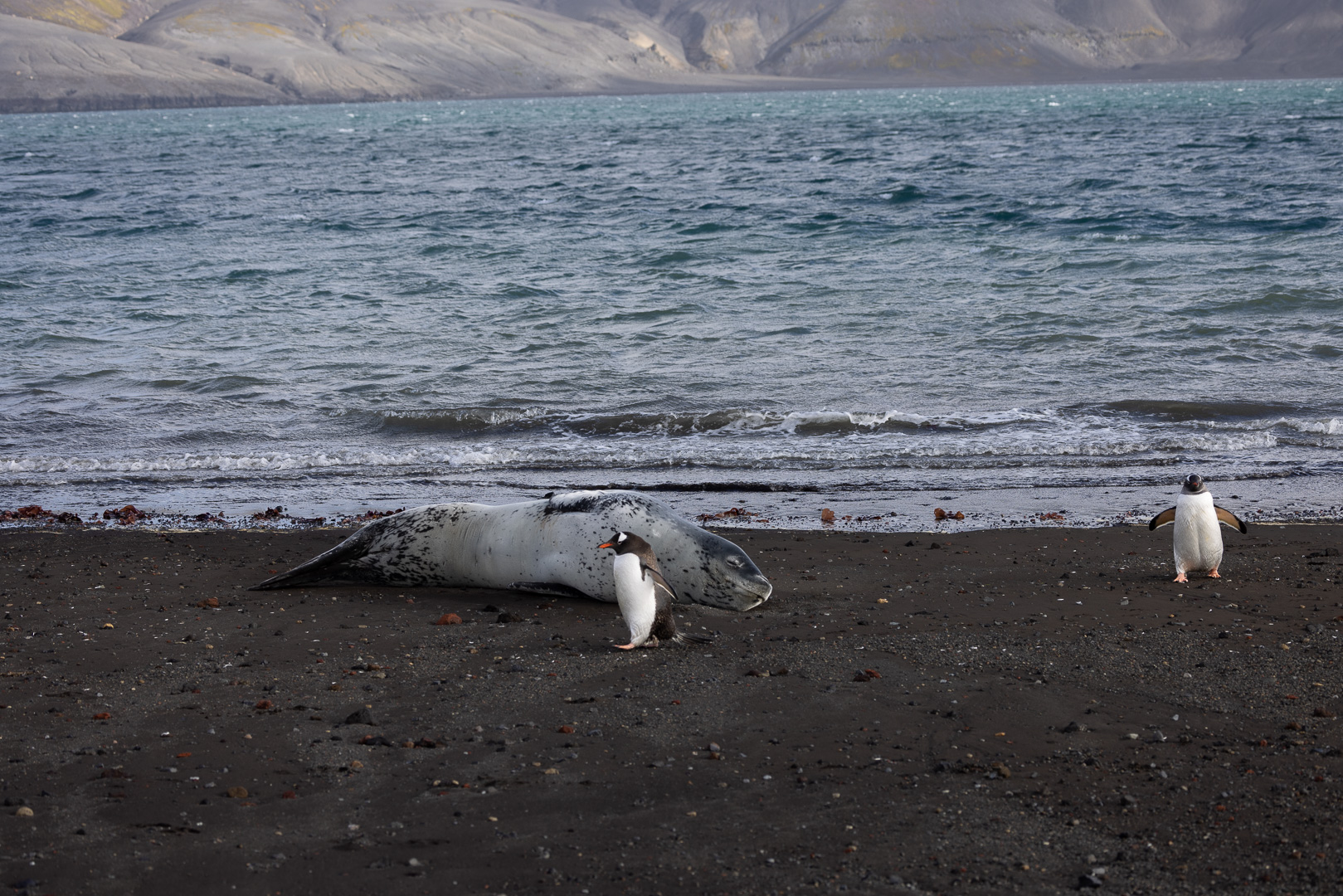 selbst den Eselspinguinen ist der Wind zu heftig und sie ziehen sich in eine Kuhle zurück. Im Hintergrund Neptuns Bellow