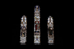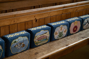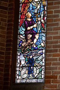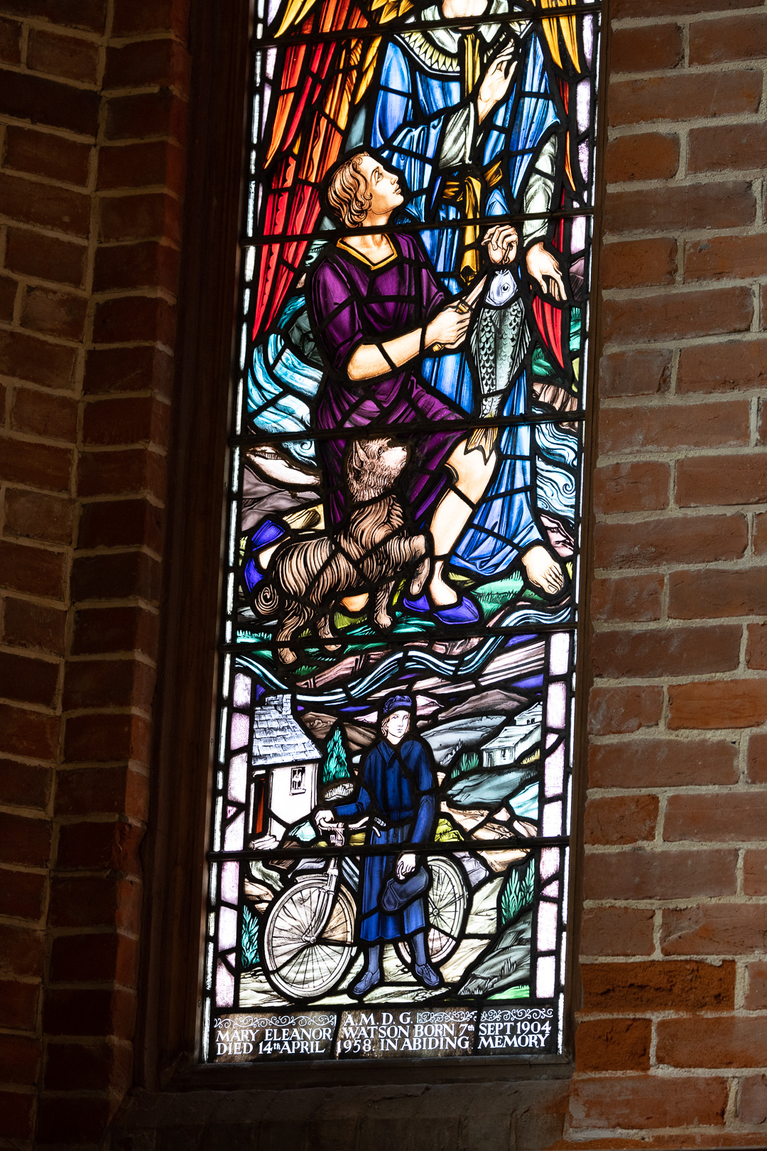Besonderheit: ein Kirchenfenster, auf dem eine Frau ein Fahrrad schiebt. Es handelt sich um eine hochgeachtete, aufopferungsvolle ehemalige Gemeindeschwester