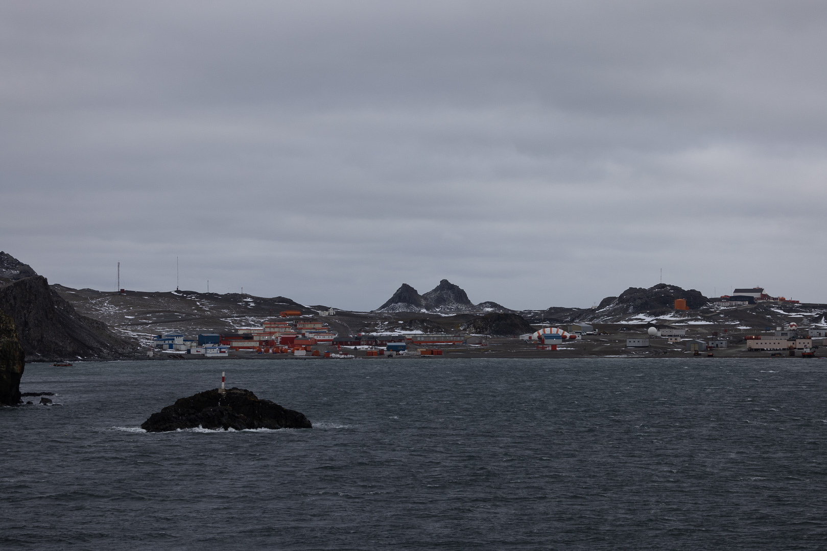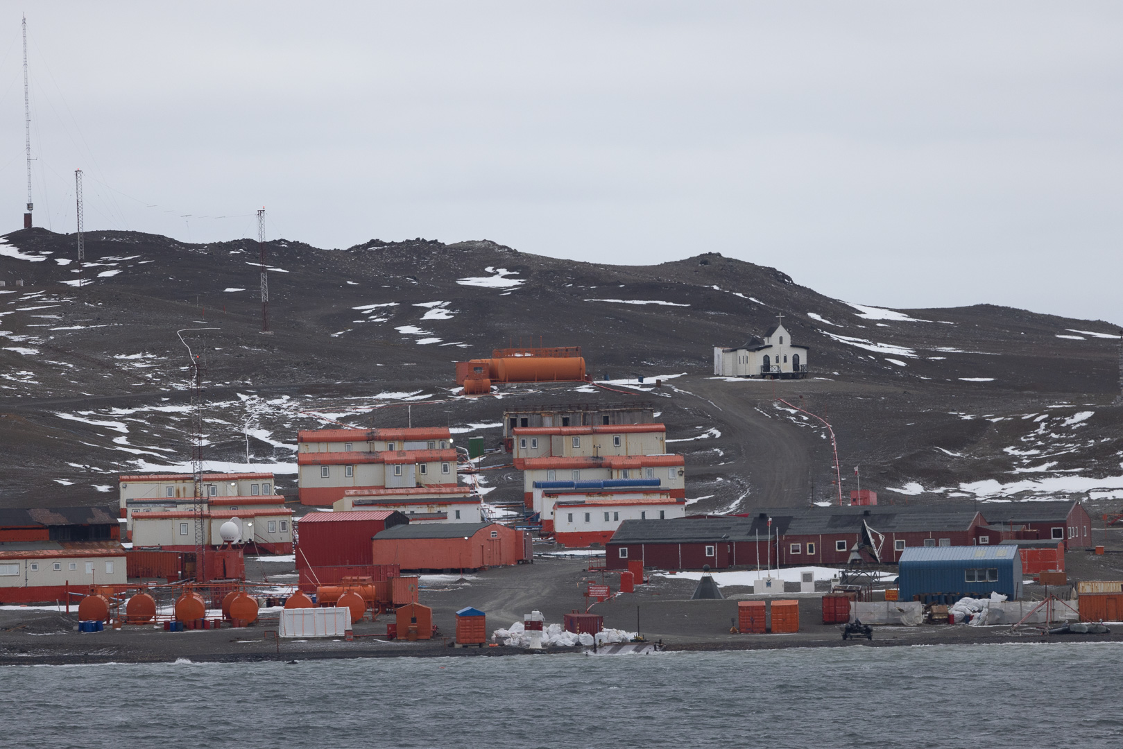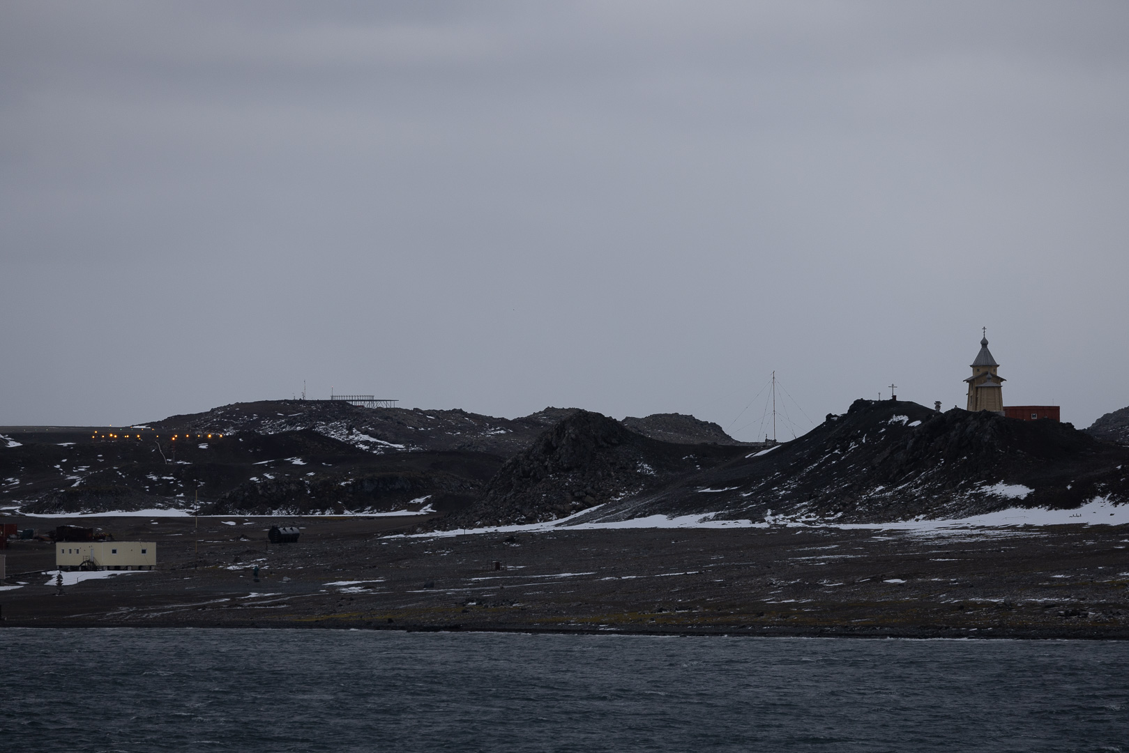 King George Island ist die grösste Insel des Archipels und hat eine hohe Dichte an Forschungsstationen. Unser Besuch dort war eigentlich nicht geplant, sondern bedingt durch die Notwendigkeit, eine schwer erkrankte Passagierin/Passagier per Flugzeug zu evakuieren, was von hier aus möglich ist, ein Flugfeld findet sich an der chilenischen Station. Neben der chilenischen Station liegt die russische mit der südlichsten orthodoxen Kirche der Welt. Ein Besuch der Station wurde nicht gestattet, der alternative Zodiak cruise war wegen des starken Winds und Wellengangs leider auch nicht möglich, lediglich der Patient konnte an Land gebracht werden.