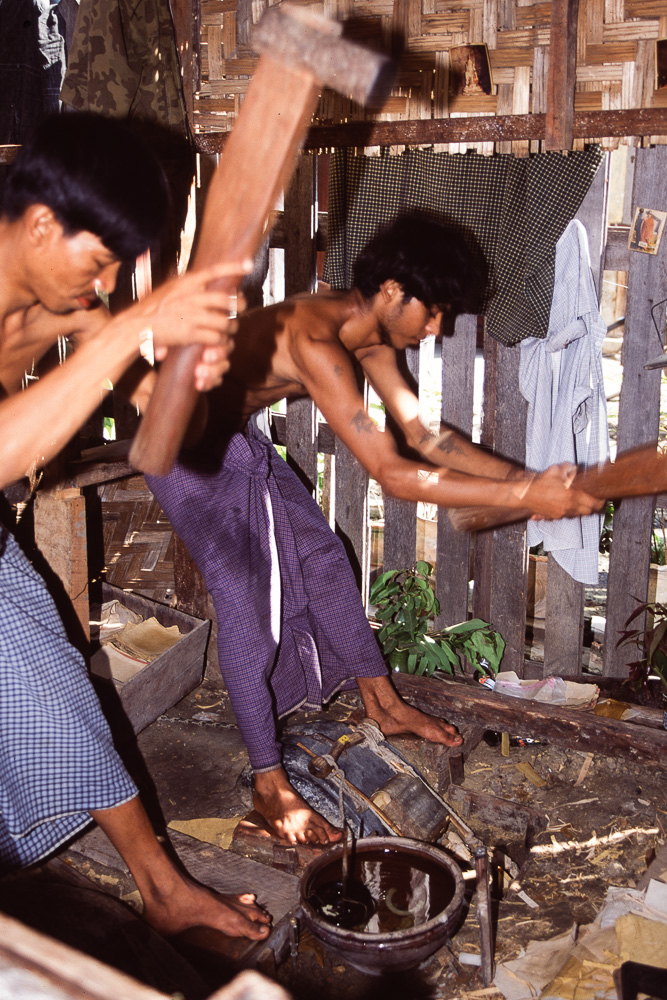 Dann haben wir eine Tempelpause. Wir besuchen in einer kleinen Nebenstraße, dort gibt es keinen Straßenbelag mehr, die Goldschläger. 5 Stunden wird das Gold