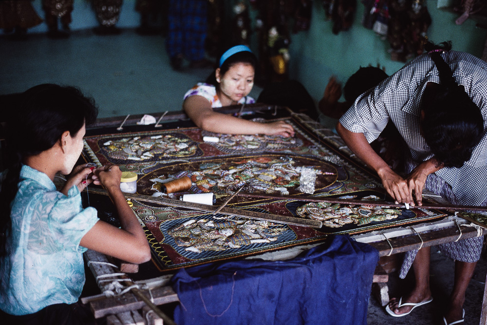 ) werden mit Glasperlen und Metallplättchen bestickt und stellen meist Motive aus Religion und Legende dar. Hatto kauft ein Stück, auf dem die Geschichte dargestellt ist, wie Garuda