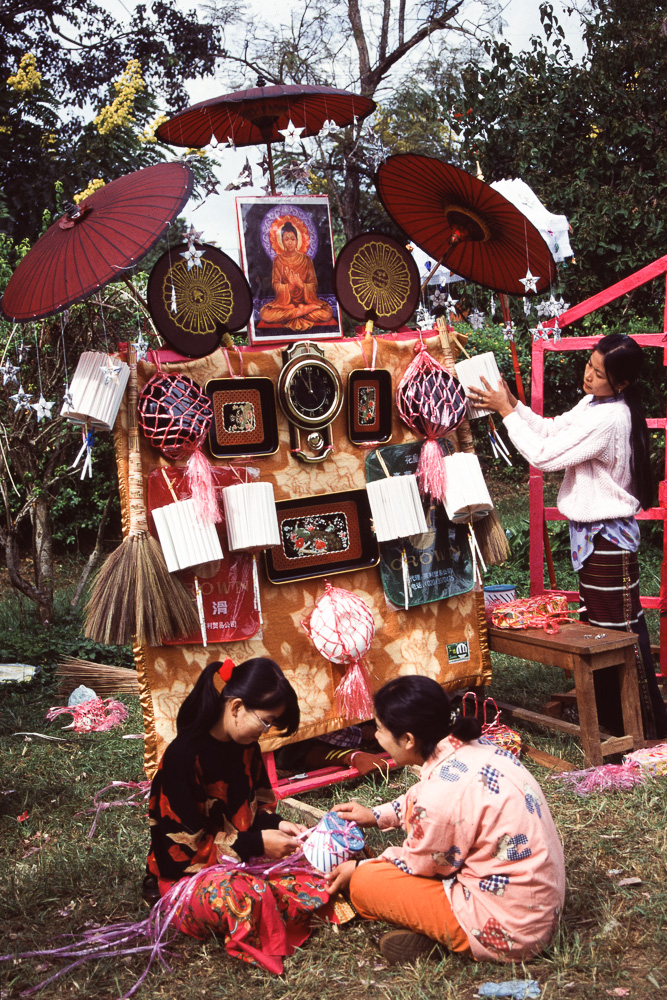 Musik. Jeweils Schüler aus einer bestimmten Region arbeiten zusammen an einem Gestell und versuchen, das schönste zu basteln. Es ist phantastisch, was hier hergestellt und arrangiert wird, da für die Mönche