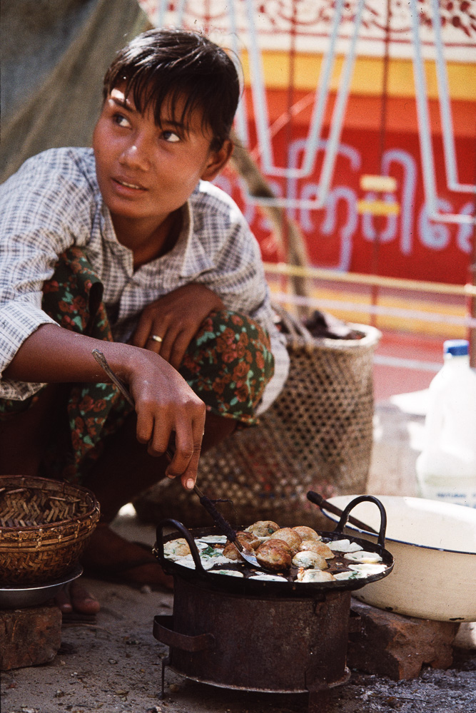 es Süssigkeiten und eine junge Frau bereitet etwas lecker aussehendes zu, es ist wohl ein Reisteig mit allerlei Kräutern, das ganze in Fett ausgebacken. Ich probiere und kaufe ihr gleich ihren Vorrat ab, es
