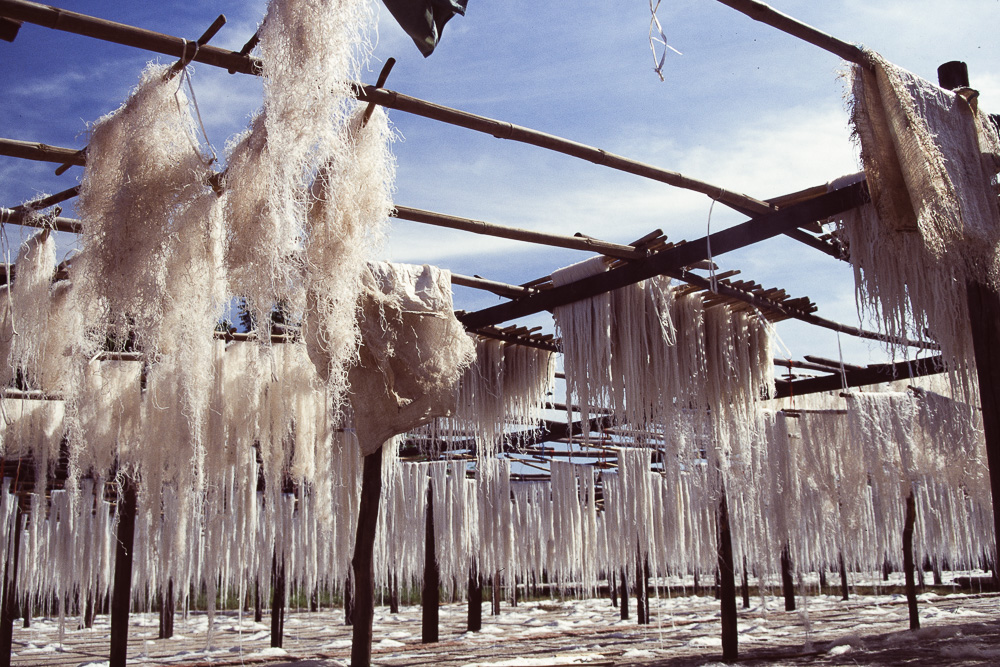 Glasnudeln werden hier aus den Erbsen gemacht, nicht wie anderswo aus Reis. Das Mahlen geschieht auswärts, die bereits gemahlenen Erbsen werden hier angeliefert. Das Mehl wird dann mehrfach gewaschen und