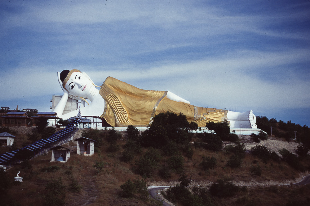 (dies scheint ein wenig neben der Neigung zum Lärm eine burmesische Eigenart zu sein, die eigentlich gar nicht so recht passen will), ein weiterer stehender Buddha soll dahinter entstehen, ca. 140 m hoch. Der liegende Buddha ist begehbar, der Eingang ist hinten an der Wade, von vorn ist er goldfarben angestrichen, von hinten gelb. Davor steht eine große Pagode am Fuß des Hügels, die Aung Sakkya Pagode,