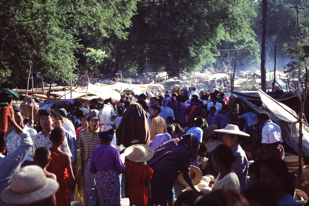 Wir erhalten um 5:30 Frühstück, damit wir rechtzeitig am Jetty sind für die Fähre über den Chindwin. Die Fähre fährt aber gar nicht dort los, wo wir hinfahren, angeblich ist die Anlegestelle tags zuvor verlegt worden, also im Eiltempo zur neuen Anlegestelle. Eine Fähre liegt bereits da, aber nichts tut sich. Schließlich kommen einige Fahrzeuge, einige mit Steinen beladene LKW, die Fähre stellt sich richtig hin, zunächst fahren die LKW hinauf. Wie unser Fahrer auch losfahren will, stellt sich heraus, daß das noch gar nicht die richtige Fähre ist, unsere kommt erst nach der Abfahrt der ersten (die in eine andere Richtung geht). Wir beobachten einstweilen das Treiben hier. Die Sonne ist inzwischen aufgegangen, so wird es auch wärmer, denn vorher war es doch ganz ordentlich kühl (für burmesische Verhältnisse). Frauen waschen, viele Frauen holen Wasser in den großen Tonkrügen, die man überall im Lande sieht, fast alle der Frauen kommen mehrmals. Zwei Ochsenkarren kommen mit Wasserfässern, sie fahren ins Wasser und werden direkt dort gefüllt und auch gleich gewaschen. Nebenan ist eine Bootswerft. Mit Booten wird Sand angelandet, der Sand wird in Körben das Ufer hinaufgetragen und dort auf einen großen Haufen geschüttet und erst dann vom Haufen weg auf einen LKW geschippt. Schließlich setzen auch wir über, gut 2 Stunde hat die Prozedur gedauert seit unserer Ankunft, und fahren dann auf der anderen Seite des Chindwin noch ungefähr eine halbe Stunde nach Pho Win Taung.