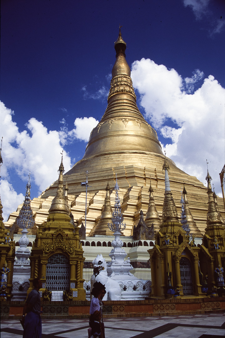 Der goldene Stupa ist beeindruckend. Er steht auf einer achteckigen Basis mit einem Umfang von 500 m, der zentrale Stupa erhebt sich 107 m, am Außenrand der Basis stehen 4 größere und 64 kleine Stupas. An den acht Ecken der Basis stehen die acht Stationen der Planeten, jeder verkörpert einen Wochentag und wird durch ein Tiersymbol dargestellt (Mittwoch wird als 2 Tage betrachtet, vormittag und nachmittag). Wir sehen viele Leute mit Opfergaben, vor allem kleine, meist weiße Schirmchen und Blumen. Wer am entsprechenden Wochentag Geburtstag hat, bringt hier am Planetenpunkt seines Tages sein Opfer. Hier stehen Figuren und kleinere Buddhas aus Marmor, diese werden von den Leuten mit Wasser übergossen, das bringt dem Buddha angenehme Kühle und die Wohltat kommt auf den Spender zurück. 8 Wochentage + Buddha ergibt die Zahl 9, dies ist daher eine Glückszahl, daher gibt es in Burma auch Geldscheine zu 45 und 90 Kyat.