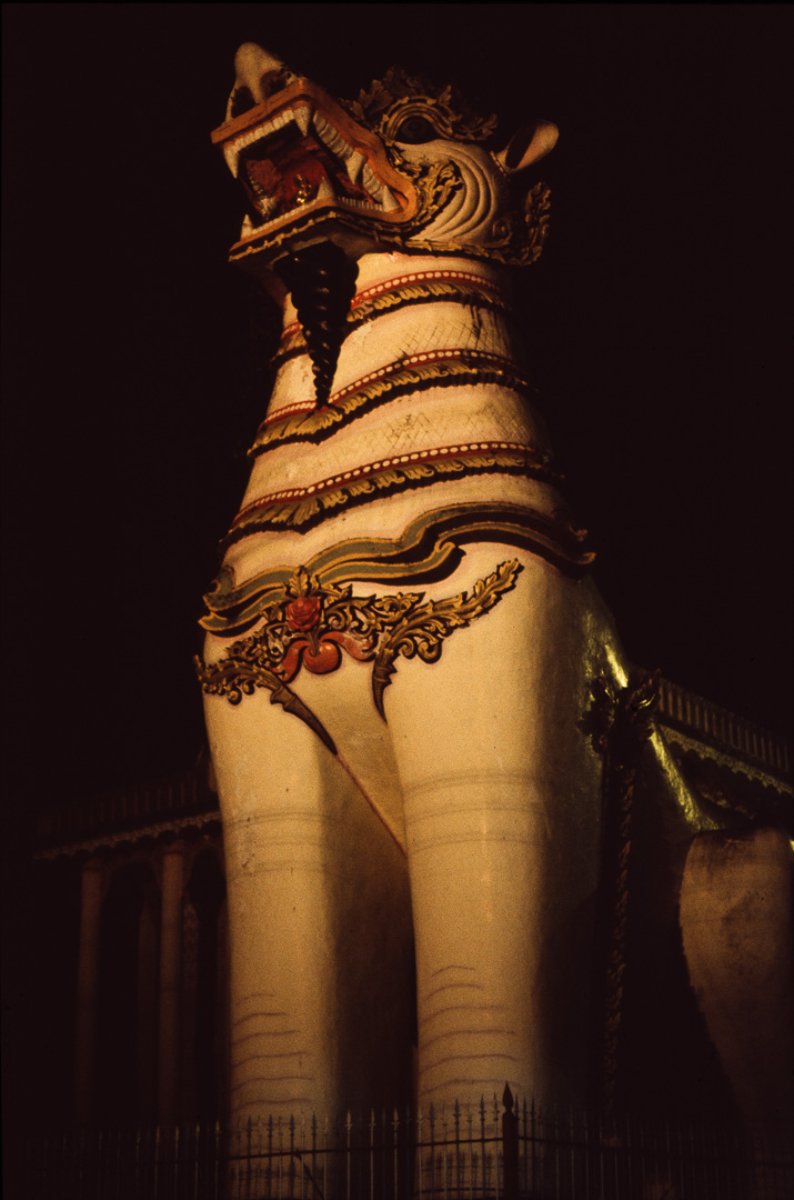 Wir fahren weiter nach Bago (= Pegu), zunächst zum Hotel, bringen die Koffer rauf ( ein Schild im Zimmer informiert darüber, daß das Auswechseln des Schlosses am Safe bei Verlust des Schlüssels 200 K kosten würde, das sind 2 DM) und dann geht’s weiter zum liegenden Buddha. Der lächelt geheimnisvoll. Erbaut 1476, dann verfallen und vom Wald überwuchert, wurde er 1900 wiederentdeckt und restauriert und 1930 mit einem Dach versehen. Daneben stehen kleine Schreine mit je drei Steinstelen mit Inschriften auf Sanskrit und auf Mon.