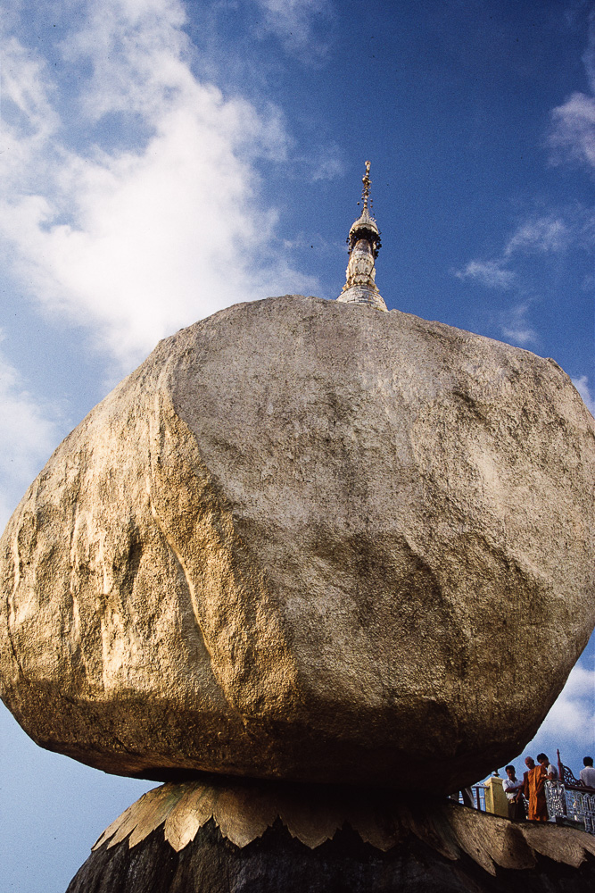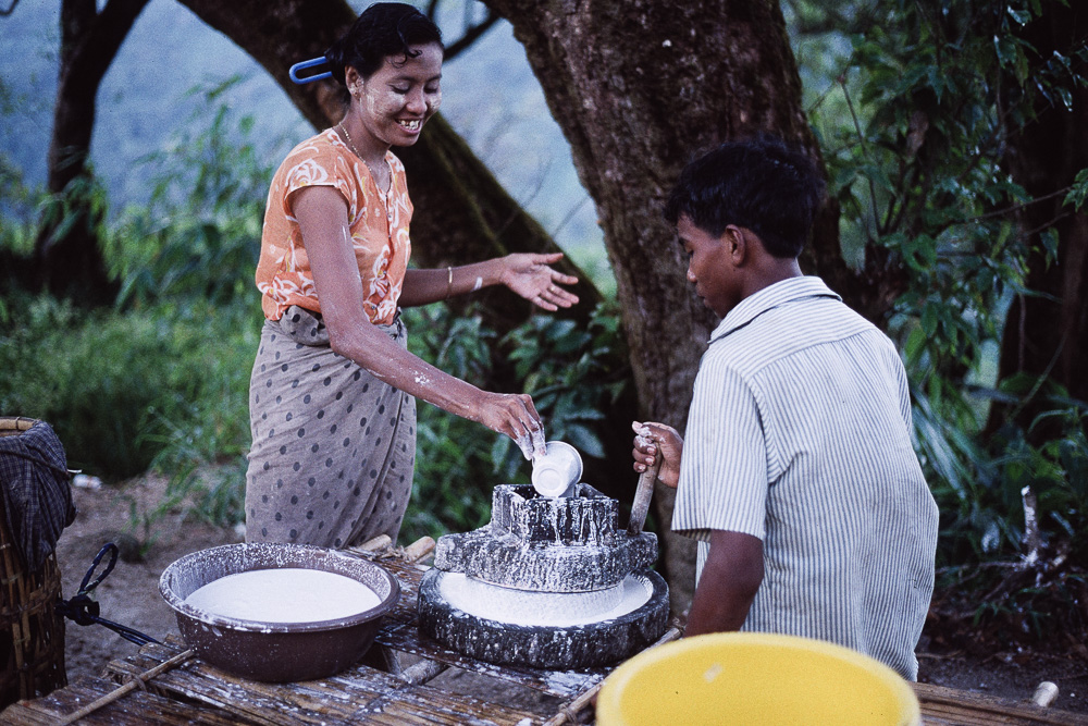Da wir heute einen langen Tag vor uns haben, brechen wir frühzeitig auf, wir fahren ca. 7:30 Uhr los (veranschlagt sind 4 ½ Stunden, was an reiner Fahrzeit auch hinkommt) . Zunächst ist die Straße noch annehmbar, sie wird aber zusehends schlechter, insbesondere nach Überquerung des Sittaung, was die lange Fahrzeit erklärt. Die meiste Zeit läuft die Bahnstrecke neben uns. Die Fahrt geht weiter durch weite Reisfelder. In den Feldern sind teilweise Quadrate mit Fähnchen abgesteckt, dies dient der Ermittlung des Ertrags (wegen der Steuer). Der nächste größere Ort ist Waw, am Ortsausgang ist ein dörflicher Bereich mit vielleicht 30 Häusern, wo wir anhalten und durch das Dorf schlendern. Alle sind freundlich, zurückhaltend und auch neugierig, fast das ganze Dorf bestaunt uns – und wir sie. Am Dorfeingang ein Teich, dort pflückt eine Frau vom Boot aus eine Art Salat, es werden nur ausgewählte junge Triebe verwendet, dies ist die billigste Gemüseart für Arme. Schöne Wassertöpfe aus Ton stehen vor allen Häusern. An einem Haus werden Dekorationen für Festivitäten gefertigt, Säulen und Wandteile, z.B. für Hochzeiten, wo so ein Aufbau vor das Hochzeitshaus gebaut wird. (Ähnliches sehen wir unterwegs an der Straße, wo für Katein gesammelt wird). Etwas entfernt sieht man Mönche in einer Reihe auf der Straße vorbeiziehen, vorneweg ein Mönch mit Gong, dahinter die Mönche mit ihren "Bettelschalen"; in der Ferne eine Pagode. Auf Tümpeln wachsen Wasserhyazinthen. Die Dorfstraße ist mit Steinen befestigt, kein Lehmweg.Wir fahren weiter über den Sittaung ins Mon – Land. Zeitweise begleitet uns der Zug, auch auf dem Dach sitzen Leute, aber nur wenige, die Berge kommen langsam näher, die Straße wird schlechter, schließlich erreichen wir Kyaikto. Dort findet eine Kontrolle statt, aber wir Touristen brauchen nicht mal auszusteigen, Kyaw erledigt alles für uns. Wir essen unseren Lunch in einem Restaurant und Guesthouse, es gibt eine gute Nudelsuppe.