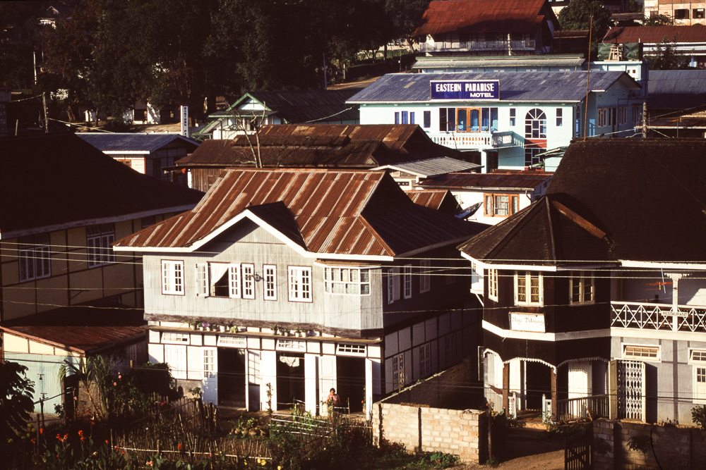 Sonnenuntergang im New Shine Hotel an. Kalaw war in der Kolonialzeit ein beliebter Luftkurort, wegen der Höhenlage ist das Klima sehr angenehm, auch heute noch sind viele Gebäude im Kolonialstil zu finden. In einem dieser Kolonialhäuser befindet sich auch das Restaurant, in dem wir zu abend essen, die Wände sind mit Wandbehängen aus Mandalay geschmückt und während des Essens spielt eine Musikgruppe auf mit Musik der Shan, sehr rhythmische Musik, dominiert von Schlaginstrumenten, zum Beispiel der großen Shan-Trommel, die mit ihrem langen Fuß und ihrer Höhe von ca. 1,20 m nicht etwa auf den Boden gestellt, sondern an einem Band umgehängt wird.