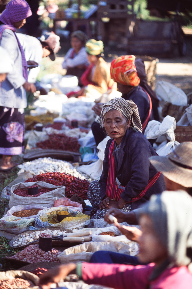 Am Morgen gehen wir zunächst für eine gute Stunde auf den Markt von Kalaw. Der Markt findet hier alle 5 Tage statt im Wechsel mit 4 weiteren Orten der Umgebung wie Heho und Taunggyi. Es ist wunderschön dort, einige Angehörige der verschiedenen Bergstämme sind zu erkennen an ihren Trachten, schwarzgekleidete Pa O und buntgekleidete Palaung in rot-blau. Als ich mir Erdnüsse in einem roten zuckrigen Guß ansehe, werden mir gleich welche zum Probieren angeboten, Eva kauft etwas in Fett Ausgebackenes und Frühlingsrollen, beides schmeckt köstlich, auch die Erdnüsse sind gut. Es gibt hier fast alles, auch Blumen, Orchideen werden hier