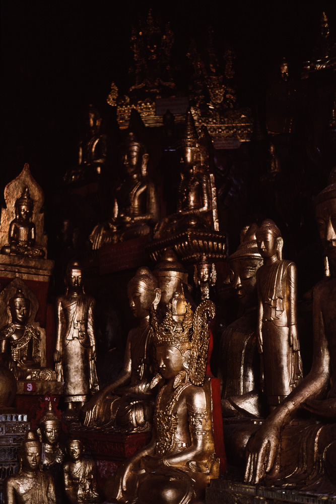 sitzend in der Erdberührungs – Mudra (Bhumisparsa Mudra), manchmal – das fällt mir hier das erste mal auf – mit einem Elefanten (selten auch andere Tiere) unter den Fingern der erdberührenden Hand die also die Erde gar nicht direkt berühren, laut Kyaw hat das keine besondere Bedeutung, sondern ist nur Zierelement um eine ausgewogenere Länge der Darstellung der Finger zu erhalten. Teilweise zeigt die Handfläche auch nach außen, in der Geste der Wunschgewährung (Varada Mudra). Insgesamt sind es mehr als 8000 Buddhafiguren. Dazwischen sind einige kleinere Höhlenräume, dorthin kann man sich zurückziehen, sie dienen als Meditationshöhlen. Nach der rechten Seite gehen Stufen nach unten, dort geht die Höhle noch ca. 150 m weiter, dort befindet sich auch der Schlafplatz der Kinari und der Badeplatz der Kinari. Der Sage nach haben in dieser Höhle zwei Kinari übernachtet nach einem Bad im See und wurden dabei vom hier residierenden Spinnenkönig überrascht und gefangen gehalten. Der Held befreite die beiden schließlich und tötete den Spinnenkönig. Symbole des Spinnenkönigs sind an der Pagoden zu sehen.