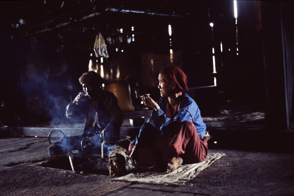 Nach dem Essen machen wir noch einmal eine Wanderung von ca. 3 Stunden, es ziehen aber Wolken auf, und da es bis zum nächsten Dorf knapp wird und unser Mr. Wellington fürchtet, daß es wegen der Wolken früh dunkel wird, kehren wir um. Hatto und ich gehen mit Mr. Wellington noch auf eine Hügelkuppe mit einer Pagode, aber wegen des Dunstes haben wir keine gute Sicht. Unterwegs begegnen wir einer Kuh, die gerade am Kalben ist und damit erhebliche Probleme hat, sie ist deswegen ziemlich aggressiv und alle halten gebührenden Abstand, Kinder sind auf einen dicken Baum geklettert und beobachten das ganze von dort aus. Mr. Wellington fragt mich, ob ich nicht Geburtshilfe leisten könnte, was ich aber wegen völliger Unkenntnis ablehnen muß, ich weiß nicht recht ob das richtig verstanden wird. Auf dem Rückweg sehen wir, daß das Kalb inzwischen geboren ist, es ist höchstens ¼ Stunde alt. Zum Abendessen gibt es – zum Reis natürlich – Huhn und Rindfleisch, das hart gebraten und dann getrocknet wurde, wir sind darüber ziemlich überrascht, wir hatten eigentlich nur Reis pur erwartet. Die Betten sind Holzgestelle, darauf liegen geflochtene Matten und eine Decke, es ist recht hart, daher schlafe ich nicht sehr viel. Die Beleuchtung besteht aus Kerzen, es gibt aber auch elektrisches Licht, eine trübe Funzel von vielleicht 20 Watt, Strom hat nur das Kloster (und damit natürlich auch wir), es gibt zwar noch einen zweiten Generator, aber der ist kaputt. Manchmal tropft der Tau von der Decke, laut Ulla gab es auch allerlei Tiere, ich habe aber keine bemerkt. Irgendwann gibt es plötzlich wieder Strom, man hört laute Musik und Gerede, es hört sich nach Fernseher an, der wohl auch in diese abgeschiedene Weltgegend vorgedrungen ist (zusammen mit Videokassetten). Plötzlich bricht der Lärm ab, Hunde beginnen zu jaulen, bis es dann ganz still wird.