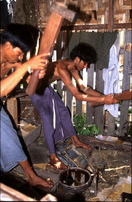 Pause. Der Hammer wiegt 7 Pfund. Das Gold wird sehr dünn ausgewalzt geliefert, geschlagen wird in 3 Schritten. Ein Ausgangsstück mißt ca. 1x1 cm, nach dem Schlagen wird es in 6 ungefähr wieder so große