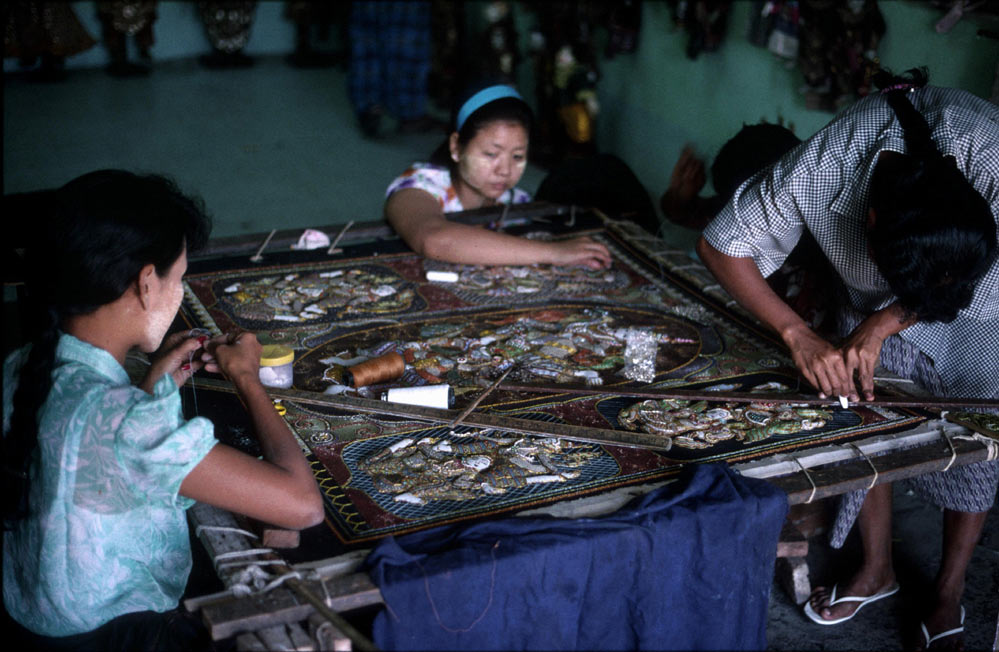 ) werden mit Glasperlen und Metallplättchen bestickt und stellen meist Motive aus Religion und Legende dar. Hatto kauft ein Stück, auf dem die Geschichte dargestellt ist, wie Garuda