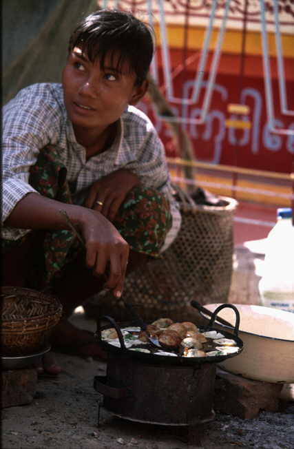 es Süssigkeiten und eine junge Frau bereitet etwas lecker aussehendes zu, es ist wohl ein Reisteig mit allerlei Kräutern, das ganze in Fett ausgebacken. Ich probiere und kaufe ihr gleich ihren Vorrat ab, es