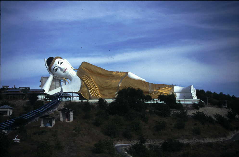 Der liegende Buddha ist begehbar, der Eingang ist hinten an der Wade, von vorn ist er goldfarben angestrichen, von hinten gelb. Davor steht eine große Pagode am Fuß des Hügels, die Aung Sakkya Pagode,