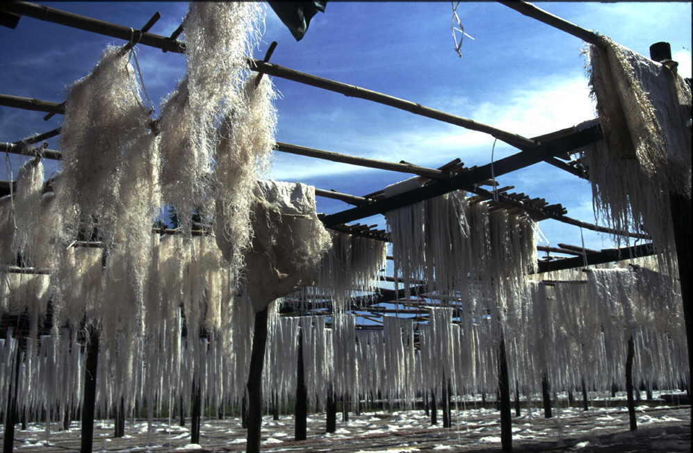 Glasnudeln werden hier aus den Erbsen gemacht, nicht wie anderswo aus Reis. Das Mahlen geschieht auswärts, die bereits gemahlenen Erbsen werden hier angeliefert. Das Mehl wird dann mehrfach gewaschen und