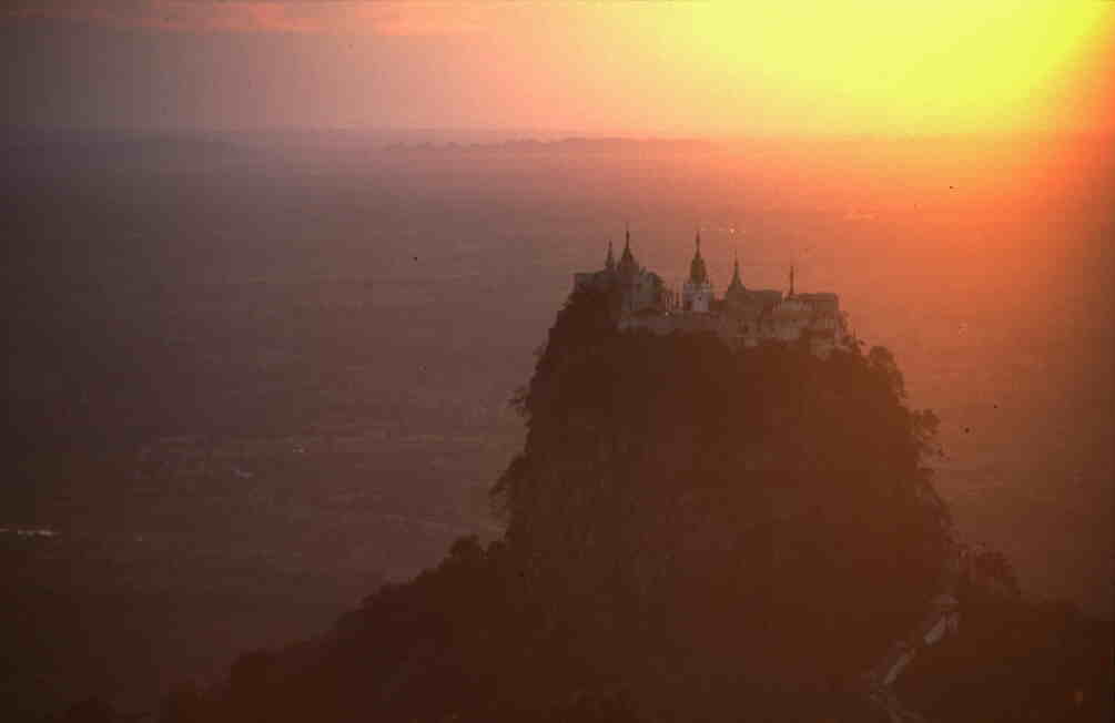 Land vor uns und davor der Granitblock des Taung Kalat, allerdings im Gegenlicht und dunstig. Die weite Ebene erstreckt sich bis Bagan, nur unterbrochen von sanften Hügelketten. Die Sonne versinkt unspektakulär