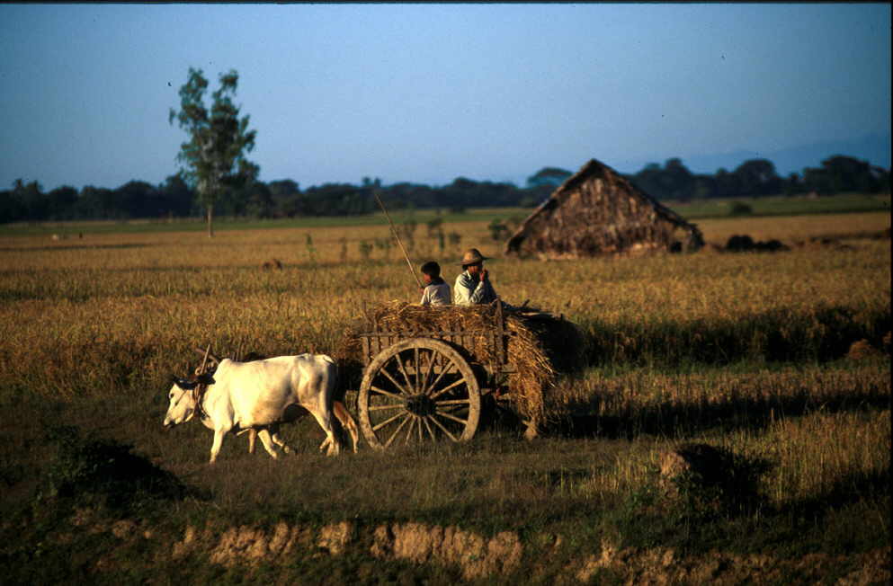 Heute müssen wir sehr früh aufstehen, um 05:00 Uhr ist Wecken, das Frühstück ist burmesisch mit sticky rice (Klebreis) weiß und dunkel (angebraten), Kokosraspeln, burmesischem Tee, Banane. Für 6:00 Uhr war der Aufbruch geplant, 20 Minuten später kommen wir weg. Wir gehen jetzt den langen Weg, den eigentlichen Pilgerpfad. Die Träger von gestern warten schon auf uns, so daß wir keine Chance haben, selbst die Starken zu spielen. Es kostet jetzt aber 500 K, gestern das kürzere Stück aufwärts kostete 200 K. Auch an diesem Weg gibt es viele Stände, vor allem auch zum Essen und Trinken, teils auch zum Schlafen für Pilger, die es nicht am selben Tag bis nach oben schaffen. Einige Mönche mit Bettelschalen begegnen uns, auch zweimal Einsiedler – Mönche mit ihren typischen Lederkappen. Die meisten Kinder winken und rufen bye – bye (oder soll das heißen buy – buy ?) Eine ältere Frau erzürnt sich sehr, daß ich zwar an ihrem Stand auf die anderen warte und schaue, aber nichts kaufe. Als wir unten sind, haben wir fast 4 Stunden gebraucht, wir gehen kurz in ein Guesthouse, dann kommt das Auto und wir fahren los nach Toungoo. Es geht zunächst den gleichen Weg zurück bis weit hinter Waw (der See, der dort auf der Karte eingezeichnet ist, scheint nicht zu existieren), und dann nach Norden.OchsenkarrenAlles ist hier ländliches Gebiet mit viel Reisanbau, wir fahren durch eines der Hauptreisanbaugebiete Burmas. Überall sieht man Straßenbauarbeiten, teilweise sogar noch in der Nacht. Steine werden von Hand kleingeklopft, dann überwiegend von Frauen in die Löcher gefüllt, wo zuvor etwas Teer (Bitumen) eingebracht wurde, teilweise wird Stein für Stein eingepaßt, darüber kommt Teer aus Fässern, die über offenem Feuer erhitzt werden, und als letztes kommt Sand darüber.