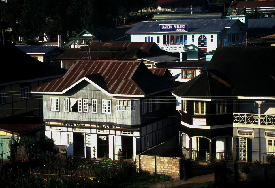 Wir fahren weiter auf der Straße Richtung Meiktila, schneiden dann aber eine Ecke ab um dann auf die Strasse von Thazi nach Taunggyi zu kommen. Es geht mal bergauf bis auf ca. 400 m, dann aber wieder abwärts in ein Tal, in dem wir lange sanft bergab fahren, bis wir schließlich in ein Seitental einbiegen und langsam wieder Höhe gewinnen, endlich geht es dann eine steile Bergstraße hinauf von ca. 300m auf 1320m nach Kalaw (mein Höhenmesser zeigt 1275 m, aber er ist lange nicht mehr geeicht, laut Reiseführer 1320 m oder 1440 m, die Höhenangaben sind unterschiedlich). Dort kommen wir ca. 17:00 Uhr kurz vor Sonnenuntergang im New Shine Hotel an. Kalaw war in der Kolonialzeit ein beliebter Luftkurort, wegen der Höhenlage ist das Klima sehr angenehm, auch heute noch sind viele Gebäude im Kolonialstil zu finden. kalawkIn einem dieser Kolonialhäuser befindet sich auch das Restaurant, in dem wir zu abend essen, die Wände sind mit Wandbehängen aus Mandalay geschmückt und während des Essens spielt eine Musikgruppe auf mit Musik der Shan, sehr rhythmische Musik, dominiert von Schlaginstrumenten, zum Beispiel der großen Shan-Trommel, die mit ihrem langen Fuß und ihrer Höhe von ca. 1 ,20 m nicht etwa auf den Boden gestellt, sondern an einem Band umgehängt wird.