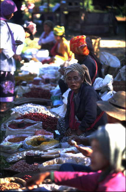 kalawnkAm Morgen gehen wir zunächst für eine gute Stunde auf den Markt von Kalaw. Der Markt findet hier alle 5 Tage statt im Wechsel mit 4 weiteren Orten der Umgebung wie Heho und Taunggyi. Es ist wunderschön dort, einige Angehörige der verschiedenen Bergstämme sind zu erkennen an ihren Trachten, schwarzgekleidete Pa O und buntgekleidete Palaung in rot-blau. Als ich mir Erdnüsse in einem roten zuckrigen Guß ansehe, werden mir gleich welche zum Probieren angeboten, Eva kauft etwas in Fett Ausgebackenes und Frühlingsrollen, beides schmeckt köstlich, auch die Erdnüsse sind gut. Es gibt hier fast alles, auch Blumen, Orchideen werden hier kmarktkangeboten für billiges Geld, in Yangon kosten sie 1000 K das Stück und werden zu besonderen Festlichkeiten gekauft. Man kann sich kaum satt sehen und satt fotografieren.