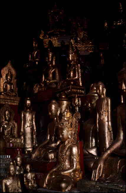 Der Pindaya – See ist künstlich angelegt, er ist komplett mit Mauern eingefaßt, die Häuser stehen weitgehend unterhalb der Ebene des Sees. Verschiedene überdachte Aufgänge mit Vorbauten führen in die Höhe zu den Eingängen der Höhlentempel, eine ganze Strecke kann man mit dem Fahrzeug hinauffahren. Nach dem Aussteigen, gleich ohne Schuhe, setzen wir uns zunächst in einen kleinen Laden einer bildhübschen jungen Danu – Frau neben dem Aufgang zum Höhlentempel von Pindaya (Shwe Umin Pagode) und bekommen Tee, Kyaw kauft dort nachher noch Tee und Kleinigkeiten, ich habe den Eindruck, das Mädchen gefällt ihm auch sehr gut. Die Höhle ist recht lang, zunächst kommtpindaykman in eine große Halle mit vergoldeten Buddha – Statuen um einen Stupa gruppiert, Figur steht dicht an Figur, der Name des jeweiligen Spenders steht dabei. Dahinter ist ein wahres Labyrinth von steinerner Buddhas verschiedener Größe und Ausführung, meist sitzend in der Erdberührungs – Mudra (Bhumisparsa Mudra), manchmal – das fällt mir hier das erste mal auf – mit einem Elefanten (selten auch andere Tiere) unter den Fingern der erdberührenden Hand die also die Erde gar nicht direkt berühren, laut Kyaw hat das keine besondere Bedeutung, sondern ist nur Zierelement um eine ausgewogenere Länge der Darstellung der Finger zu erhalten. Teilweise zeigt die Handfläche auch nach außen, in der Geste der Wunschgewährung (Varada Mudra). Insgesamt sind es mehr als 8000 Buddhafiguren. Dazwischen sind einige kleinere Höhlenräume, dorthin kann man sich zurückziehen, sie dienen als Meditationshöhlen. Nach der rechten Seite gehen Stufen nach unten, dort geht die Höhle noch ca. 150 m weiter, dort befindet sich auch der Schlafplatz der Kinari und der Badeplatz der Kinari. Der Sage nach haben in dieser Höhle zwei Kinari übernachtet nach einem Bad im See und wurden dabei vom hier residierenden Spinnenkönig überrascht und gefangen gehalten. Der Held befreite die beiden schließlich und tötete den Spinnenkönig. Symbole des Spinnenkönigs sind an der Pagoden zu sehen.