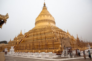 Die Shwezigon-Pagode wird als Urform der typischen burmesischen Pagode betrachtet, sie wurde bereits von König Anawratha begonnen. Im Sockel des mächtigen Baus sieht man glasierte Tafeln aus Terrakotta mit Darstellungen des Jataka, die meisten allerdings in schlechtem Zustand. Die Pagode ist inzwischen komplett vom Sockel bis zur Spitze vergoldet. Mehrere Pavillons gruppieren sich um das Gebäude, an den 4 Ecken jeweils mit Buddhastatuen. An der Pagode werden neben Buddha vor allem auch die 37 Nats verehrt, sie wurden vom Erbauer dort aufgestellt, um den auch heute noch sehr populären Volksglauben in den Buddhismus einzubeziehen. Eine Besonderheit ist ein kleiner Pavillon mit 2 Nat-Figuren, die Vater und Sohn darstellen, wobei der Sohn älter ist als der Vater, weil der Sohn zuerst zum Nat wurde und erst anschließend der Vater.