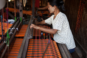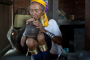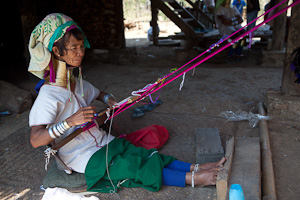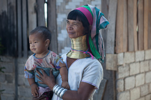 Kayah ist die Heimat vor allem von Karen mit verschiedenen Untergruppen, die bei uns bekannteste sind wohl die kleine Gruppe der Padaung, die sogenannten Giraffenhalsfrauen. Vor Ort sieht man nur noch wenige Frauen, die diese Tradition noch fortführen, und es bedarf etwas Einfühlungsvermögen und der Tatsache, dass unser Shan-Guide hier einige Leute kennt, um einige Fotos zu machen, ohne dass man das Gefühl hat, es handelt sich um eine Art Safari oder Menschenzoo (wie dies wohl in Thailand der Fall ist). Wer sich fotografieren lässt, erwartet auch ein Geldgeschenk (derzeitiger Tarif ca. 1000 - 2000 Ky pro Frau), deswegen kommen, wenn man fotografiert, evtl. auch andere Frauen dazu, aber nicht jede will sich fotografieren lassen. Wenn eine Frau am Webstuhl arbeitet, unterbricht sie in der Regel auch nicht ihre Arbeit für ein Foto, sie gestattet aber meist das fotografieren. Aber im Gegensatz zu anderen Regionen gibt es hier keine jungen Frauen, die lediglich um dieses Gelderwerbs willen sich die Halsspiralen anlegen, es gibt kaum noch junge Frauen, die die Ringe tragen. Einige allerdings verdingen sich in Shops am Inle-See, wo sie früher nur als Foto-Objekte Touristen anlocken sollten, inzwischen ist es verboten, dass Padaung-Frauen am Inle-See allein auf das Einkommen durch die Zurschaustellung angewiesen sind, sie müssen als reguläre Mitarbeiterinnen angestellt werden und zum Beispiel auch handwerklich tätig sein. Inwieweit dies die Situation dieser Frauen gravierend verändert hat, kann ich nicht bezurteilen.