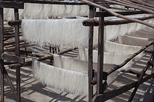 Neben der Weberei in den einzelnen Familien gibt es auch grössere Webereien. Dort werden unter anderem auch die Stoffe für die Turbane der Pa O hergestellt, in der typisch orangen Farbe. Auf dem Weg dahin kommen wir auch an mehreren Betrieben vorbei, die Glasnudeln herstellen, die dann im Freien auf grossen Gestellen getrocknet werden.
