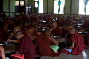 Auch im nahegelegenen Mönchskloster sind viele schon in Ferien, da sie ihre Prüfung bereits abgelegt haben, nach bestandener Prüfung werden weitere zu ihren Familen fahren, so dass nur noch ungefähr 40 Mönche in der Ferienzeit zurückbleiben. Jetzt treffen wir die, deren Prüfung noch bevorsteht, bem Lernen, das im Augenblick vor allem im Auswendiglernen der Sutren besteht. Während ihres Grundstudiums haben die Mönche 3 Prüfungen innerhalb von 3 - 10 Jahren abzulegen.Danach ist ein weiteres Studium zum "educated monk" möglich, um zum Beispiel einer Lehrtätigkeit nachzugehen. Die Leitung eines Klosters als Sayadaw ist aber unabhängig von einem so erworbenen Titel.