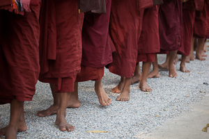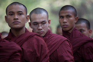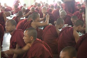 Auf der anderen Seite der Brücke liegt ein großes Kloster. Im Maha Ganayon Kyaung wohnen ungefähr 700 Mönche. Auch hier ist es ein touristisches Ereignis, den Mönchen beim Essen zuzusehen, das pünktlich um 11:00h beginnt. Normalerweise wird hier das von den einzelnen Mönchen über den Tag gesammelte verzehrt, zur Zeit unseres Besuchs hatten die Mönche allerdings eine großzügige Spende erhalten, einschließlich Kuchen und Eiscreme zum Dessert, so dass an diesem Tag das Sammeln ausfiel.