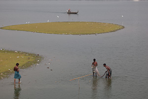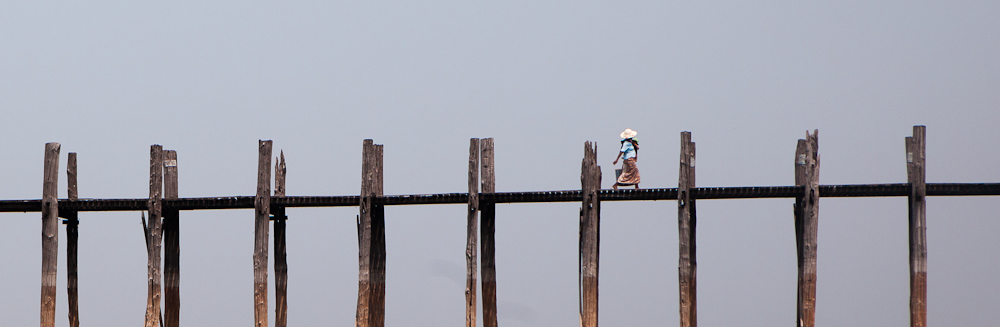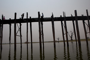 Manchmal liegt die Brücke auch im Trockenen. Die Pfeiler sind aus Teakholz, das Holz stammt aus dem alten Königspalast in Innwa und fiel an beim Umzug des Königs nach Mandalay. Teilweise sind die alten Pfeiler schon ziemlich verrottet, teilweise durch Betonpfeiler ersetzt. Die Lücken in der die Fläche halten sich jedoch in Grenzen, die Brücke ist eine wichtige Verbindung zu Dorf und Pagode auf der Insel sowie für die Studenten. Vor allem morgens und abends ist sie stark frequentiert. Es bietet sich an, den Hin- oder Rückweg mit dem Boot zurückzulegen (wenn der Wasserstand das zulässt), denn vom Boot aus hat man einen schönen Blick auf die Brücke.