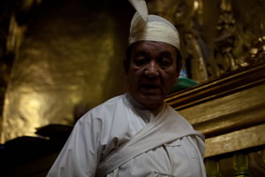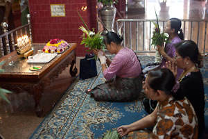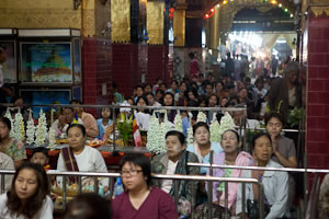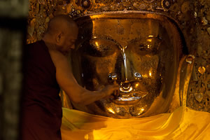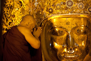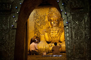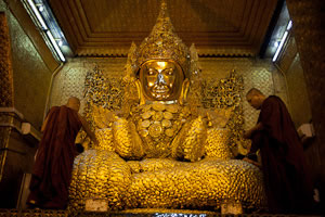 Der Tempel des Maha Muni ist der wichtigste Wallfahrtsort in Mandalay. Die Herkunft der zentralen Statue eines Buddha in der Geste der der Berührung (Bhumisparsa Mudra) liegt im sagenhaften Dunkel, es wird überliefert, dass die Statue bereits zu Lebzeiten des Buddha angefertigt worden sei. Wahrscheinlich stammt sie aus dem ersten Jahrhundert vor Christus, wurde 1784 von Mrauk U hierher gebracht. Die Figur ist mit Ausnahme des Gesichts über und über mit Blattgold bedeckt, so dass die ursprüngliche Form verloren gegangen ist, auch die wertvollen Steine auf der Brust sind mit der Goldschicht überzogen. Nur Männern ist es erlaubt, das Zentrum des Heiligtums zu betreten und Blattgold auf der Figur anzubringen. Im Gegensatz zu früher, wo eine Spende freiwillig war und mir sogar Blattgold in die Hand gedrückt wurde, da ich keines mitgebracht hatte, wird man heute genötigt, beim Herabsteigen von der Statue eine Spende zu hinterlassen. Vor dem Heiligtum sitzen Gläubige und meditieren oder rezitieren Sutren, Frauen ausschließlich hinter der Absperrung und vor den zeitlichen Zugängen. Um auch bei größerem Andrang möglichst vielen den Blick auf den Maha Muni zu ermöglichen, das Bild auf mehrere Fernsehbildschirme übertragen.
