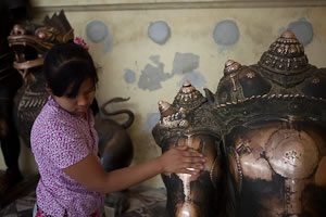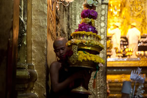 Etwas für Frühaufsteher ist die allmorgendliche Waschung des Maha Muni. Um halb 4:00 Uhr morgens stehe ich an der Straße und warte auf das bereits am Vorabend angeheuerte Taxi. Es ist erstaunlich, wie viel um diese Zeit bereits auf der Straße los ist. Während ich warte, kommt ein erster Mönch vorbei, der vom Hotel seinen Reis erhält. Drei Blumenverkäuferinnen treffen ein und bauen ihre Verkaufsstelle neben dem Hotel auf.