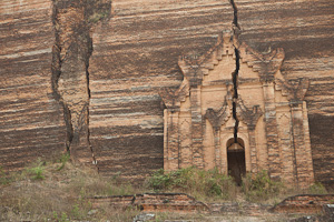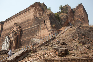 Das markanteste Gebäude ist die unvollendete Mingun-Pagoden, bei der nur der Sockel fertiggestellt wurde. Von der Ferne sieht sie aus wie aus dem Fels gemeisselt statt aus Backsteinen erbaut. Sie sollte die grösste Pagode der Welt werden mit einer Höhe von ungefähr 180 m. Der Bau begann 1790 mit Sklaven und Kriegsgefangenen als Arbeiter und wurde nach dem Tod des Königs Bodawpaya im Jahr 1819 eingestellt. 1938 verursachte ein Erdbeben einen grossen Riss in dem bis dahin vollendeten riesigen Sockel. Trotz des Zustandes als Ruine, und auch wegen dem als Pagode funktionierenden Heiligtum im östlichen "Eingang" mit einer Buddhastatue, gilt das Gebäude als Pagode und darf nur barfuss bestiehgen werden. Der Aufstieg ist inzwischen recht bequem mit gut gebauten Treppen und sogar Geländern an der Treppe.