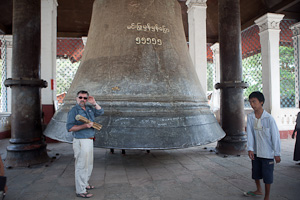 Weiter nach Norden steht die grosse Mingun - Glocke, die in einm separaten Gebäude (Tazaung) hängt. Es ist die grösste hängende und unbeschädigte Glocke der Welt mit einm Gewicht von 90 Tonnen. Touristen und Burmesen lieben es, sich dort fotografieren zu lassen, amn besten beim Anschlagen der Glocke oder auch unter der Glocke stehend. Die Glocke wurde im Jahr 1808 für die grosse Mingun-Pagode gegossen.