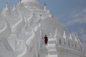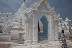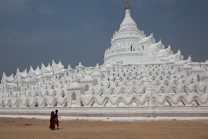Ganz im Norden steht die Hsinbyume Pagode (Myantheindan), wohl die ungewöhnlichste Pagode in Myanmar, zumindest was die Form angeht. Und zumindest eine der schönsten. Angeblich wurde sie von König Bgyidaw 1816 erbaut zu Ehren seiner verstorbenen Frau, der Prinzessin Hsinbyume. Dazu passt der Charakter des Tempels. Ganz in weiss getüncht, blendet das Gebäude die Augen beim grellen Sonnenlicht. Die Pagode symbolisiert den mystischen Berg Meru, das Zentrum der Welt und Fixpunkt der Weltachse, sie hat 7 Terassen, die mit ihrer Wellenform die Bergketten um den Berg Meru mit den dazwischen liegenden Weltenmeeren symbolisieren.