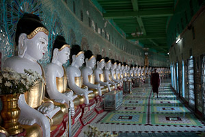Umin Thonze ist ein Höhlentempel, in dem 45 Buddha Figuren an der bogenförmigen Wand aufgereiht stehen. Die Gläubigen bringen Opfer und verharren jeweils vor der von Ihnen besonders verehrten Statue.