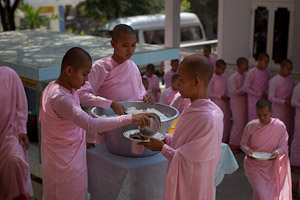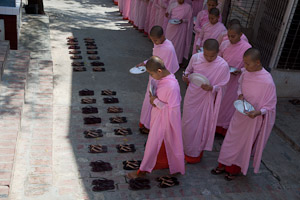 Eines der Nonnenklöster ist Zayartheingyi. Beeindruckend die Ordnung, die beim Abstellen der Schuhe eingehalten wird, selbst in den strengsten Mönchsklöstern geht das nicht so diszipliniert. Die Nonnen erhalten von den Gläubigen keine fertig gekochten Speisen, sondern sammeln nur einmal in der Woche die Zutaten und kochen dann selbst in der Klosterküche.