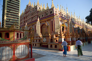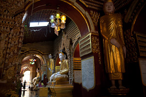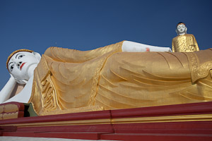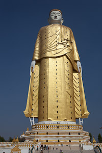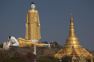 Weit übertroffen wird das Ganze jedoch von den beiden riesigen Buddhastatuen. Der liegende Buddha wird zwar in der Grösse inzwischen von dem liegenden Buddha Win Sein Taw Ya in der Nähe von Mawlamyaing übertroffen, ist aber deutlich schöner - und inzwischen auch noch vergoldet. Dahinter steht die grösste stehende Buddhastatue der Welt mit einer Höhe von fast 130 m, ein Aufzug führt in der Statue nach oben, während der liegende Buddha über die Wade zugänglich ist (darin befindet sich ein überraschend schlichter Altar in Schulterhöhe). Auch der stehende Buddha ist komplett vergoldet. Das Ganze wurde inauguriert vom 2006 verstorbenen ehemaligen Sayadaw (bei dem wir bei unserem letzten Besuch noch eine Audienz hatten).