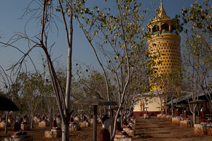Etwas weiter, ca. 12 km vor Monywa steht die Moe Hyin Thanboddhay Pagode, auch Pagode der 100.000 Buddhas genannt und soll an die 600.000 Budhastatuen aller Grössen enthalten. Die Pagode wurde von 1939 bis 1958 erbaut, der Erbauer soll einer besonderen esoterischen Strömung angehört haben, an den Säulen im Umgang um die Pagode findet man viele magische Symbole. Vorsicht, die Pagode wird bereits um 17:00 Uhr geschlossen. Der Baustil ist einzigartig für Myanmar (und wohl auch sonst), ein Zuckerbäcker kommt einem in den Sinn.