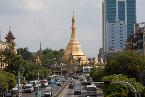 Zentrum der Stadt ist die Sule-Pagode, von hier aus werden die Entfernungen gemessen. Die ungefähr 2000 Jahre alte Pagode ist umflossen vom Verkehr und umgeben von modernen und