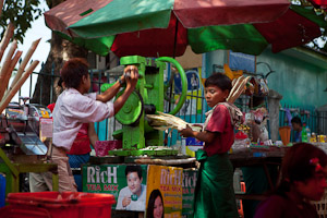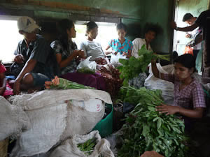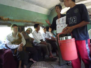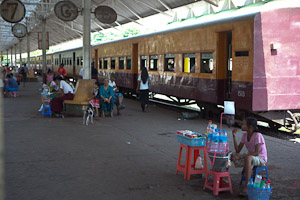 Yangon ist umgeben von einer Bahnlinie, auf der ein Nahverkehrszug die Stadt umrundet (Yangon circular line) Tickets sind erhältlich am Hauptbahnhof (Yangon Station, Bogyoke Aung San Road) für 1 $ (Touristenpreis), damit kann man in 3 h einmal die Stadt nördlich komplett bis hinaus in die ländlichen Gebiete umrunden, wenn man will natürlich auch vorzeitig aussteigen. Wir haben die Tour zu zweit gemacht am Samstag, wo nicht so viel los ist, der Zug wird unterwegs trotzdem gut voll mit Passagieren, die aus der Stadt heraus auf das Land wollen oder umgekehrt, Marktfrauen mit großem Körben und Säcken, die unterwegs ihre Waren sortieren und bündeln. Ab und zu steigen Bettler oder Verkäufer von allerlei Angeboten zu und gehen durch die Abteile, da werden Landkarten, anatomische Tafeln, Wundermittel, Wasser oder auch Gartenprodukte angeboten. Auch für diese Leute lohnt sich die Zugfahrt, da für Einheimische ein Ticket nur 10 Kyat kostet.