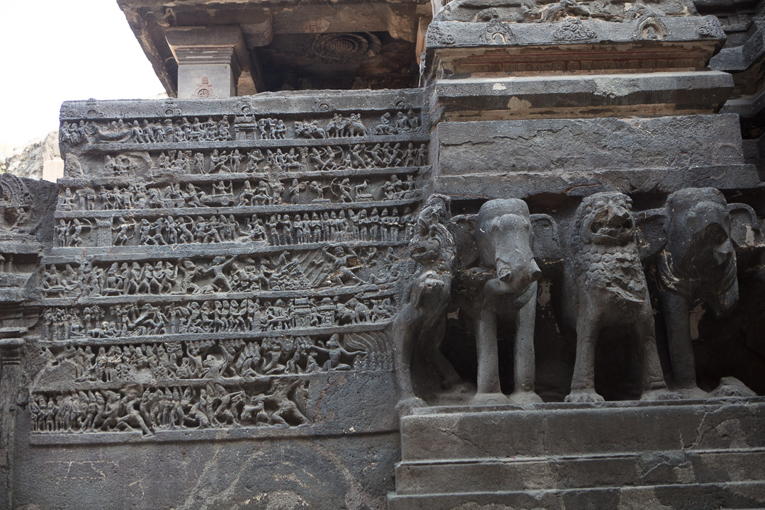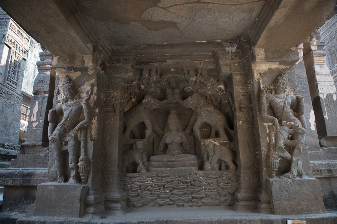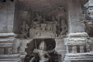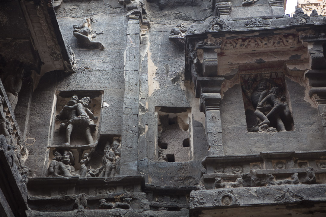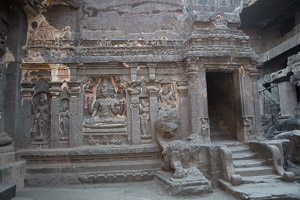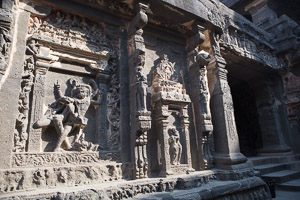 Im Gegensatz zum älteren Ajanta finden sich hier kaum nennenswert Malereien. Es handelt sich auch nicht nur um buddhistische Höhlentempel, der Schwerpunkt sind hinduistische Tempel, daneben finden sich jedoch auch buddhistische und Jain Höhlenheiligtümer. Das absolute Highlight ist der riesige hinduistische Kailasa-Tempel, der den tibetischen Berg Kailash als Sitz des Gottes Shiva repräsentiert. Der Tempel ist nicht im eigentlichen Sinne ein Höhlentempel, denn es fehlt das Höhlendach, der Tempel ist von oben nach unten aus dem Fels herausgeschlagen mit dem Eingang in der Felswand. Höhlenartig in die Wand geschlagen ist jedoch ein kleineres Heiligtum für die Muttergottheiten sowie ein deutlich erhöht verlaufender Umwandlungsgang mit Reliefs und Skulpturen, der durch seine erhöhte Lage näher an das Niveau des eigentlichen Tempels mit dem Heiligtum heranrückt, während die ebenerdige Umwandlung lediglich um den massiven Sockel herumführt. Nach mancher Lesart soll hinter der Konstruktion eines so aus dem Felsen geschlagenen Tempels die Idee stehen, dass der Mensch an diesem Tempel nur das unwesentliche, nämlich den leeren Raum, geschaffen hat, während das Material des Tempels sich seit Beginn der Welt an Ort und Stelle befunden hat. An anderen Höhlen ist dieses Bauprinzip teilweise aufgenommen worden, die jainistischen Höhlen 30 und 32 zeigen eine ähnliche Anlage mit einem zentralen Schrein ohne Höhlendach.