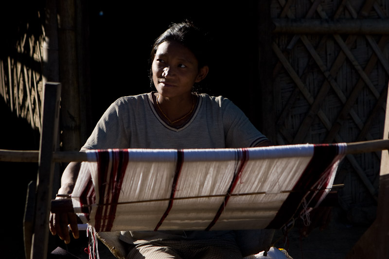 Weberin in Longwa. Bei den Naga werden sehr schöne Webarbeiten gefertigt mit unterschiedlichen Designs je nach