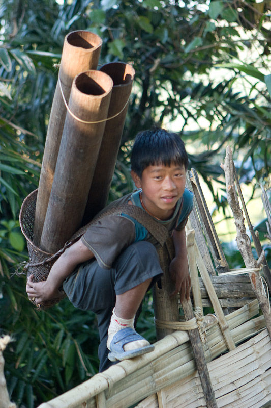 Wasserholen. Das Wasser für den auf einer Anhöhe in 1500 m Höhe liegenden Ort Longwa muss im Tal geholt werden, als Behälter deinen Bambusröhren