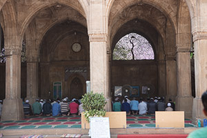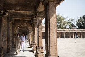 Der grosse Innenhof mit dem Waschbecken wird (wie in Delhi) von einem Säulengang umgeben. Zwei grosse Säulen stehen als Stümpfe neben dem Hauptportal der Gebetshalle, sie sind bei einem grossen Erdbeben 1819 zusammengebrochen, obwohl sie als sog. "shaking minarets" zumm Schutz vor Erdbeben gebaut waren.